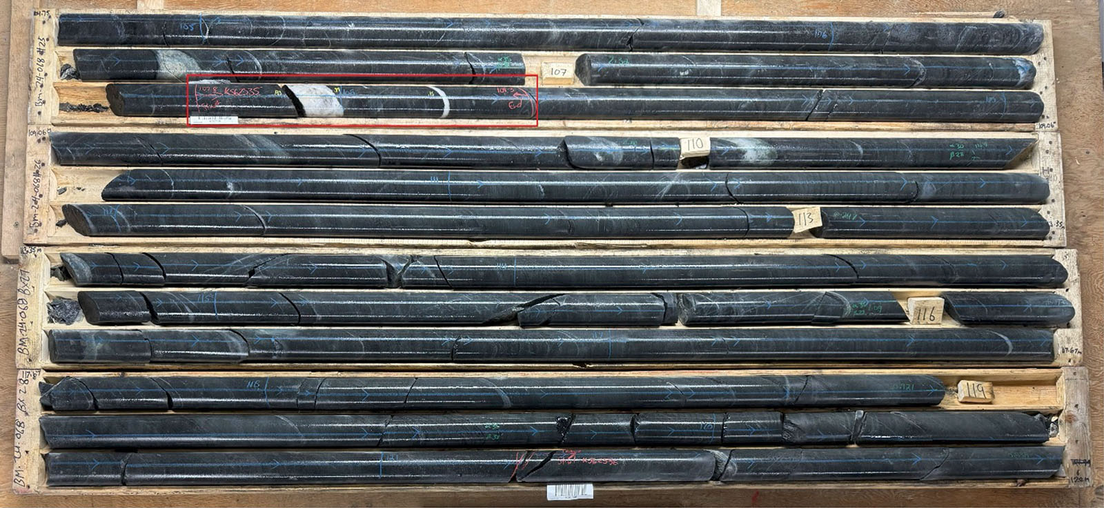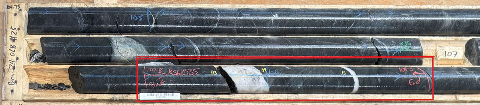 BM24-068 intersected 0.12% Cs₂O over 0.50 m from 107.80 to 108.30 m within mafic volcanics containing bands of Cs-rich biotite throughout, and two small pegmatites with minor biotite.